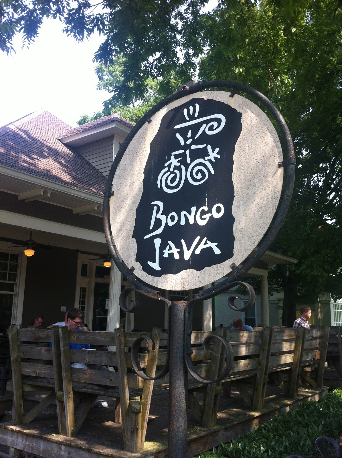 Onze eerste stop buiten het Best Western van deze dag zou Bongo Java worden. Een tentje dat door veel inwoners van Nashville als een van de trendy hotspots gezien wordt om een ontbijt te nuttigen. Het kon natuurlijk niet zo zijn dat we daar niet heen zouden gaan. Om ongeveer kwart voor negen vertrokken we richting de wijk Hillsboro, waar Bongo Java gelegen is. Het eerste stuk ging heel voorspoedig, totdat we op een gegeven moment bij een deel van Nashville kwamen waar er veel werk aan de weg uitgevoerd werd. Daardoor kwamen we in een mega file verzeild die ook nog eens mega vast bleek te staan. Met behulp van de kaart van het navigatie systeem, konden we er echter uiteindelijk toch nog aan ontsnappen, hoewel het wat caperiolen van de chauffeur van deze rit, Rene, nodig had. Helemaal buitenom gereden, maar dat ging een stuk sneller dan in de rij te blijven staan, wat ertoe leidde dat we een kleine tien minuten nadat we aan de file ontsnapt waren de auto voor de deur van Bongo Java konden parkeren. Heerlijk rustig gelegen, met een echt klassieke veranda met oude houten meubels. Daar schoven we dan ook aan, lekker in de schaduw en een koel briesje. Frank en ik namen de bestelling op die binnen doorgegeven moest worden. Drie maal een bagel en een maal een burrito (voor Simon), vier jus d'orange en vier cappuccino, dat was uiteindelijk het ontbijt voor de hele groep en ik moet zeggen: het was de moeite waard om even in de file voor te hebben gestaan. Lekkere biologische bagels met dito beleg en een erg ontspannen sfeer waarin we ze konden nuttigen. Een fijn begin van de dag, hier in Nashville (waar de temperatuur inmiddels op aan het lopen was tot 33 graden....).